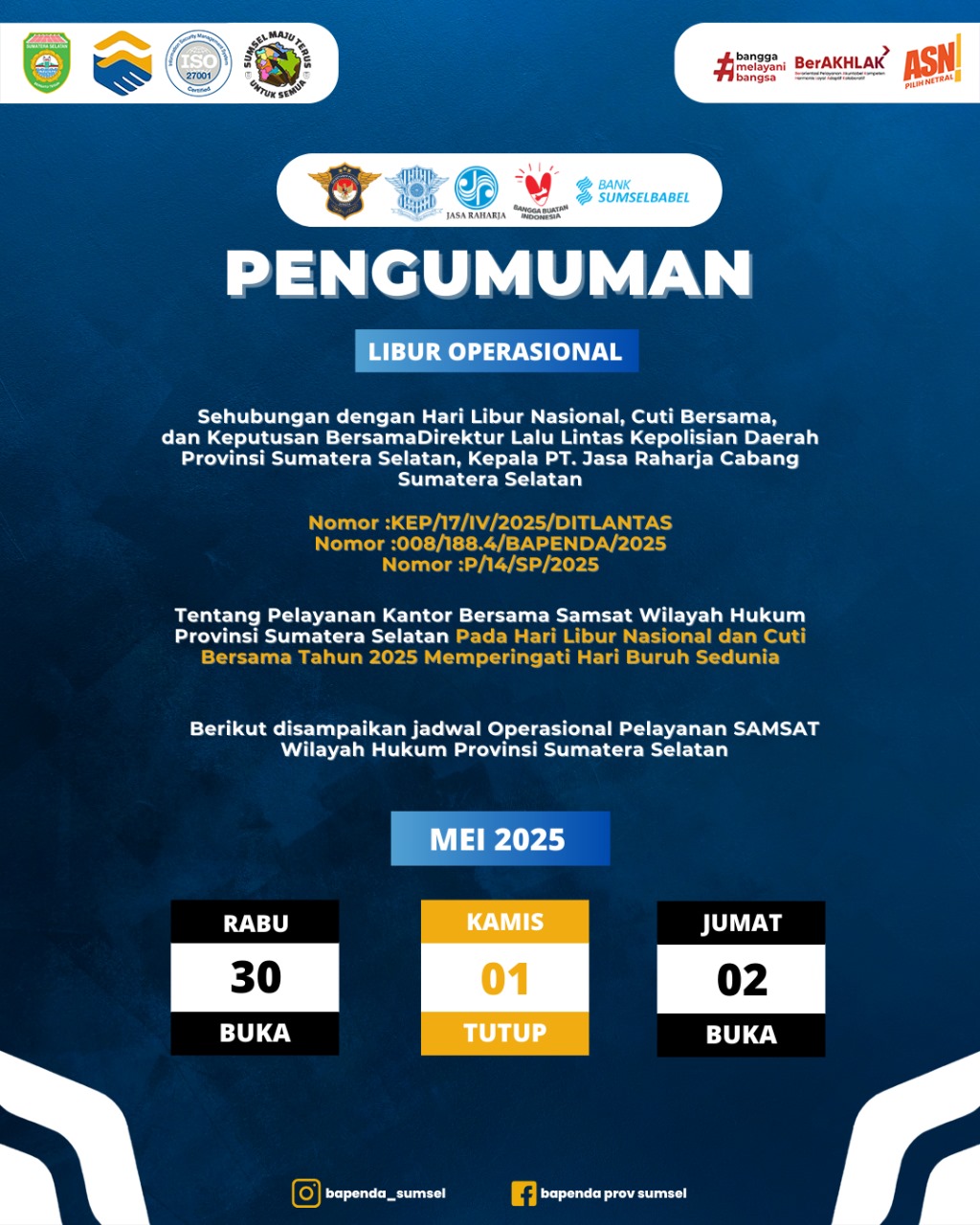 Pengumuman libur operasional Pelayanan Samsat dan BPKB dalam rangka memperingati hari buruh internasional 2025